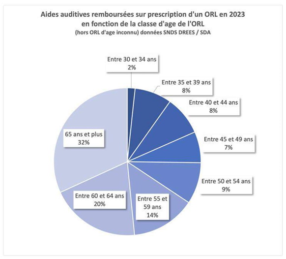 A l’occasion de ce rectificatif, le SDA diffuse aussi de nouvelles données complémentaires, notamment les pyramides des âges des audioprothésistes et des ORL et la proportion d’appareils prescrits pour chaque tranche d’âge d’ORL (52 % des aides auditives sont prescrites par des ORL de 60 ans et plus).