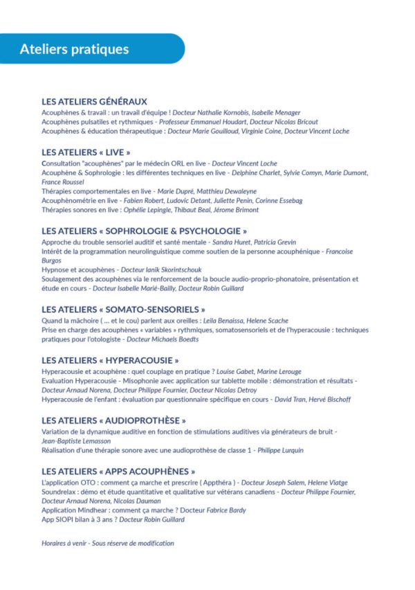 Les dernières avancées de la recherche, dans le domaine, seront mises en avant (notamment l’étude multicentrique Afrepa, dont nous nous somme fait l’écho ici). Et les enjeux cliniques du quotidien seront abordés : patients acouphéniques ayant un audiogramme normal, échec thérapeutique, implantation cochléaire…