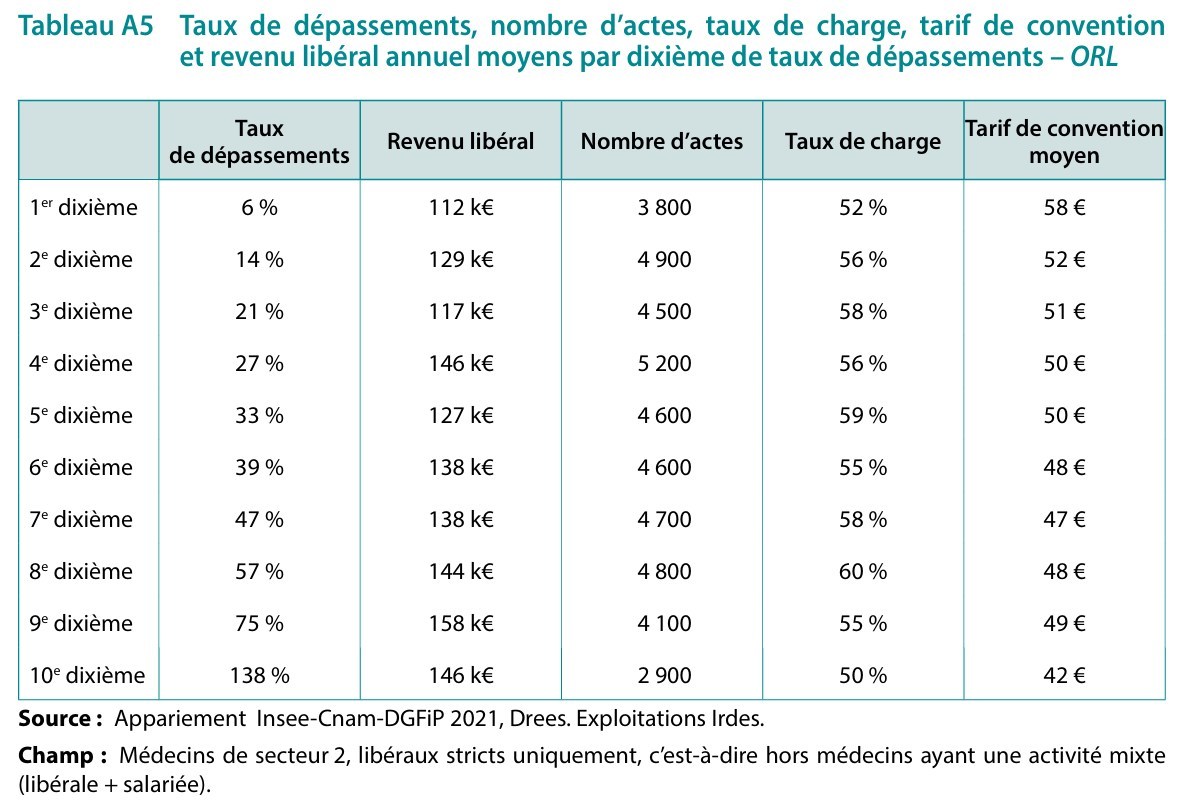 L’un des tous derniers rapports de l’Irdes, Institut de recherche et documentation en économie de la santé, scrute les dépassements d’honoraires des médecins : leur fréquence, leur importance, leur variation en fonction de l’âge du praticien, etc., par spécialité. Les ORL de secteur 2 figurent parmi celles qui pratiquent le plus ces dépassements.