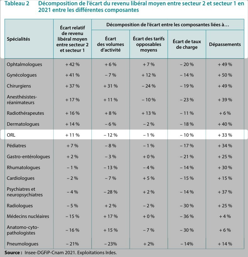 Les ORL de secteur 2 réalisent en moyenne moins d’actes que leurs confrères de secteur 1 (ce qui baisse leur revenu libéral de 12 % par rapport à celui de ceux en secteur 1, toutes choses égales par ailleurs), leurs tarifs de convention sont globalement identiques en moyenne, tandis que leurs charges sont plus élevées (ce qui baisse leur revenu libéral de 10 % par rapport à celui des secteur 1, toutes choses égales par ailleurs), explique l’Irdes. Mais leurs dépassements font plus que compenser ces pertes : ils ont, au total, un revenu libéral moyen de 11 % plus élevé que celui des médecins du secteur 1.