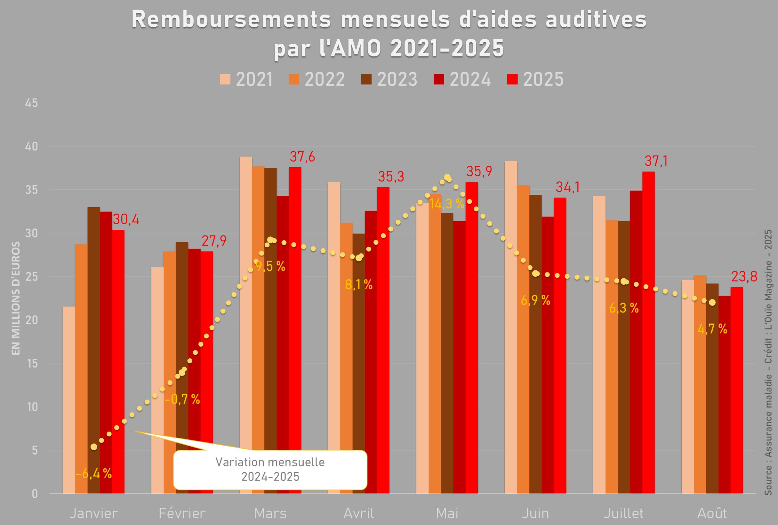En août dernier, l’Assurance maladie obligatoire a pris en charge pour 23,8 millions d’euros d’appareils auditifs. Cette somme est en croissance de 4,7 % par rapport au mois d’août 2024. Sur 8 mois, la croissance des remboursements est de 3,6 %. Le total se monte à environ 262,3 millions d’euros. Ces dernières données viennent confirmer l’hypothèse d’une reprise du marché liée aux renouvellements de la 1ère vague de malentendants appareillés en 2021. Elles sont aussi en cohérence tendancielle avec les chiffres des ventes sell in en volumes, récemment rendus publics par les industriels.