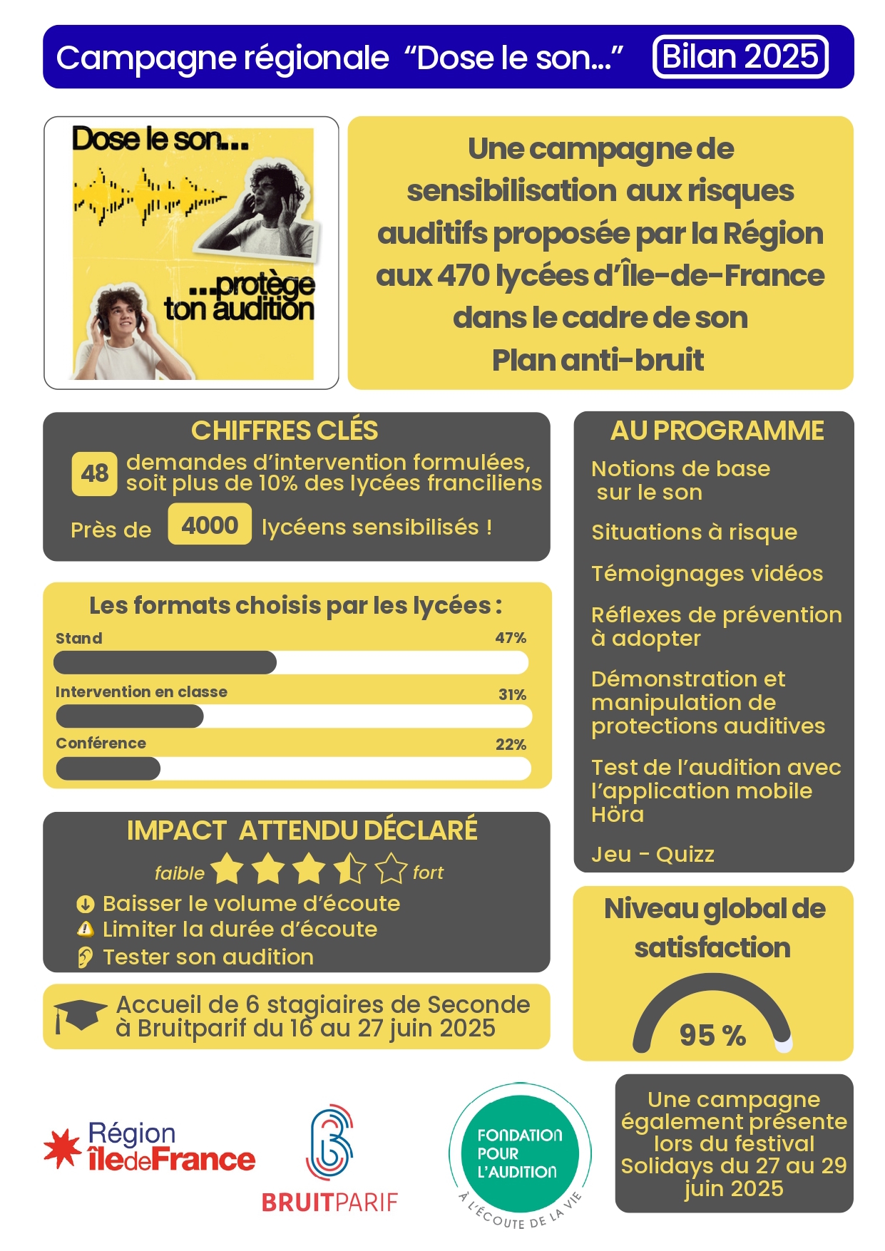 La campagne “Dose ton son… Protège ton audition” a été conduite par la Région Ile-de-France grâce à l’accompagnement de la Fondation pour l’audition et de Bruitparif, mais aussi de France Acouphènes et de l’ARDDS : 4 000 lycéens franciliens en ont bénéficié depuis mars 2025.