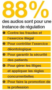 Les résultats du sondage et la méthodologie (à consulter en fin d’article) ont été présentés en fin de première journée de l’EPU par Erwan Lestrohan, directeur conseil chez Odoxa. L’acquiescement à l’Ordre semble découler, plus généralement, de la nécessité de renforcer l’encadrement de la profession. 6 audios sur 10 estiment que les autorisations d’exercice et les pratiques professionnelles sont insuffisamment contrôlées, mais aussi, à plus de 77 %, que les patients ne sont pas suffisamment protégés contre les publicités trompeuses et les dysfonctionnements. De ce fait, près de 9 audios sur 10 se prononcent pour une instance de régulation, afin d’endosser diverses missions (voir infographie ci-contre).