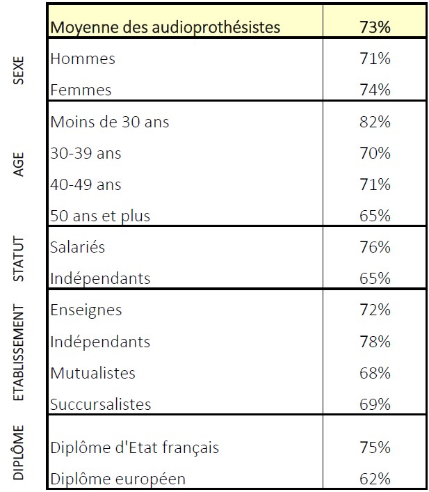 *Pour ce faire, Odoxa a appliqué le calcul suivant : 73 % des audioprothésistes sont favorables à la création d’un Ordre et 82% d’entre jugent une cotisation de 300€ annuels raisonnable (73 % x 82 % = 60 %).