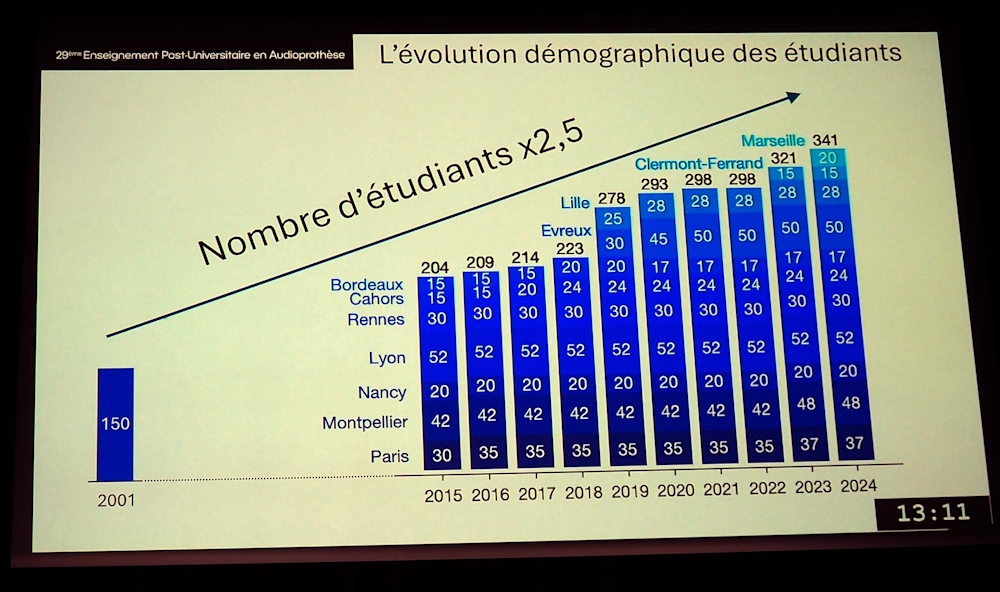 Jean-Charles Ceccato a également présenté des données récentes sur les étudiant·es. Le nombre de places en 1ère année a plus que doublé depuis 2001 (+ 53 % depuis 2018), notamment grâce à l’ouverture de 4 nouvelles écoles depuis 2019. La multiplication des écoles ces dernières années a induit une forme de divergence entre les enseignements dispensés en audioprothèse sur le territoire, chaque université ayant des approches plus ou moins approfondies selon les matières.