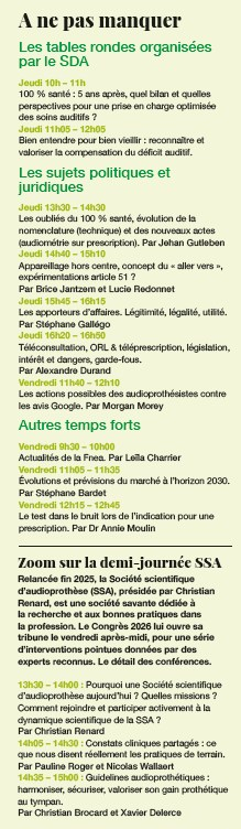 Brice Jantzem : Effectivement, suite à des divergences de positions avec le SDA, les membres du Synea ont fait le choix de ne pas être présents au Congrès. Mais il ne faut pas oublier qu’à l’origine, seuls les fabricants exposaient ! La surface est certes réduite, mais notre budget est à l’équilibre. Nous avons cependant repensé le programme à l’aune de cette évolution. La nouvelle SSA – Société scientifique d’audioprothèse – organise une demi-journée de conférences avec des personnalités de tous bords (voir encadré dans la colonne de droite), c’est un évènement particulièrement fédérateur. Sur la durée, nous sommes dans une phase de transition et réfléchissons à faire évoluer notre approche afin de rester attractifs pour les acteurs de la filière. Le Congrès est gratuit et nous souhaitons qu’il le reste. Il s’agirait par exemple de se regrouper avec d’autres congrès de plus petite taille, comme celui de la SFA, car les audios ont de moins en moins de temps à consacrer à ces rencontres. Nous envisageons aussi un rapprochement avec des fabricants qui pourraient intégrer leur roadshow au Congrès. Cela leur faciliterait la tâche compte tenu des importantes contraintes de la loi anti-cadeaux et leur permettrait de toucher les étudiants, toujours nombreux au Congrès grâce à notre lien avec Fnea.